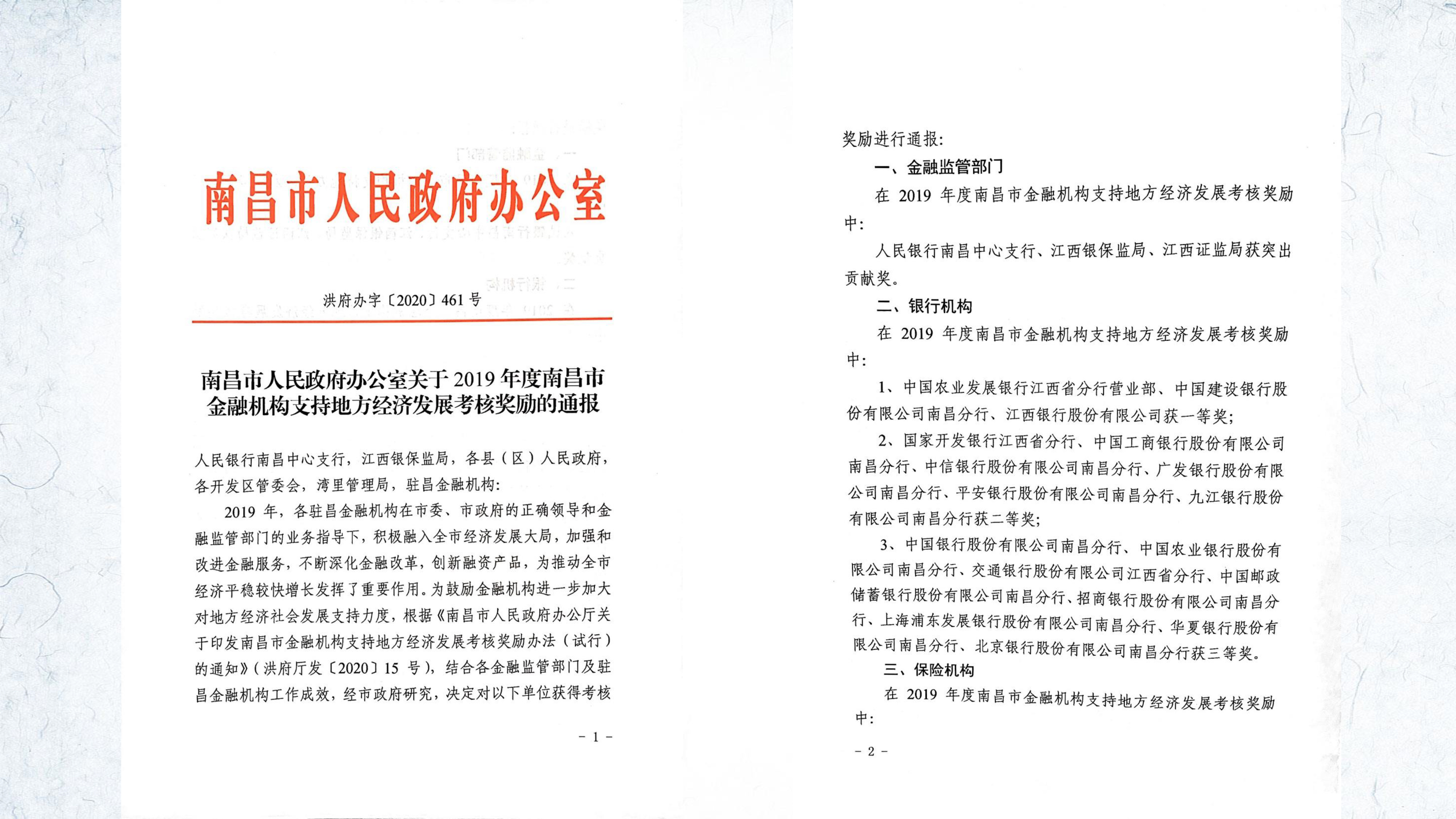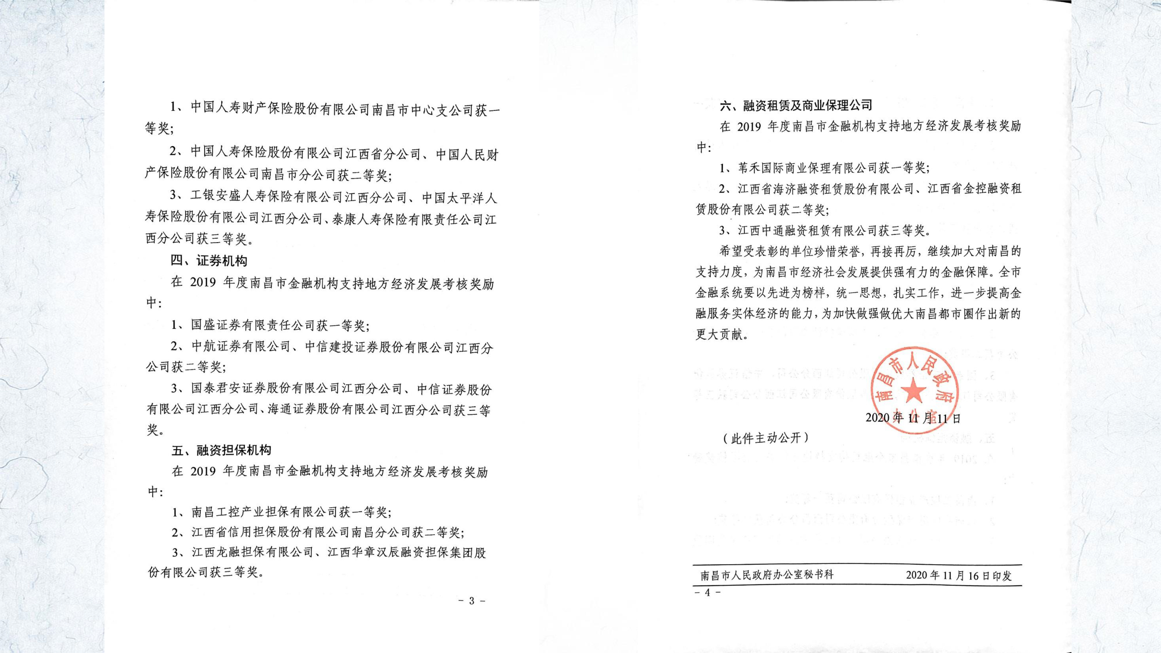 ? ? ? 近日,南昌市人民政府辦公室下發(fā)《關(guān)于2019年度南昌市金融機(jī)構(gòu)支持地方經(jīng)濟(jì)發(fā)展考核獎勵的通報(bào)》,江西省海濟(jì)融資租賃股份有限公司榮獲融資租賃及商業(yè)保理公司二等獎。