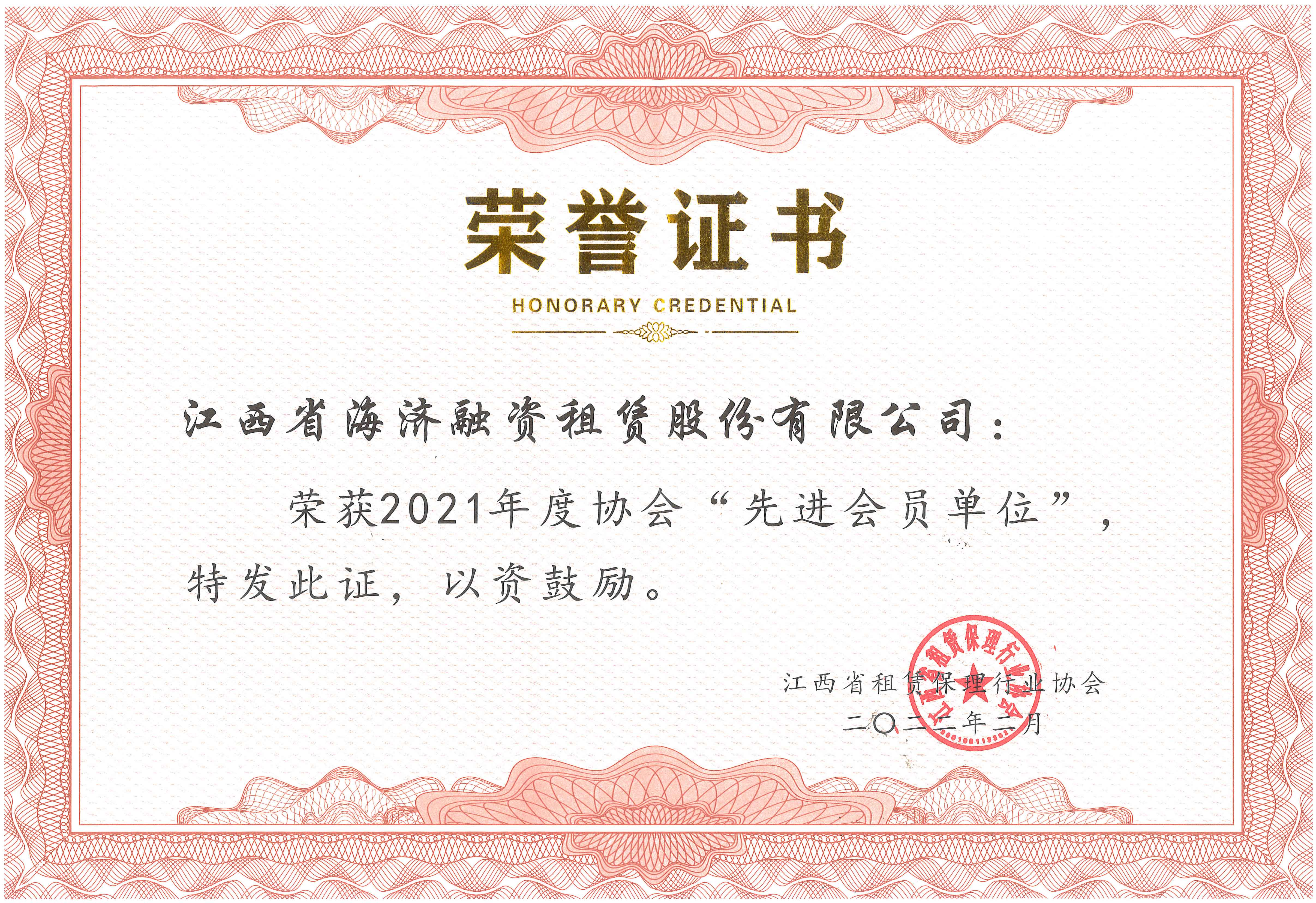 海濟公司榮獲江西省租賃保理行業(yè)協(xié)會2021年度先進會員單位