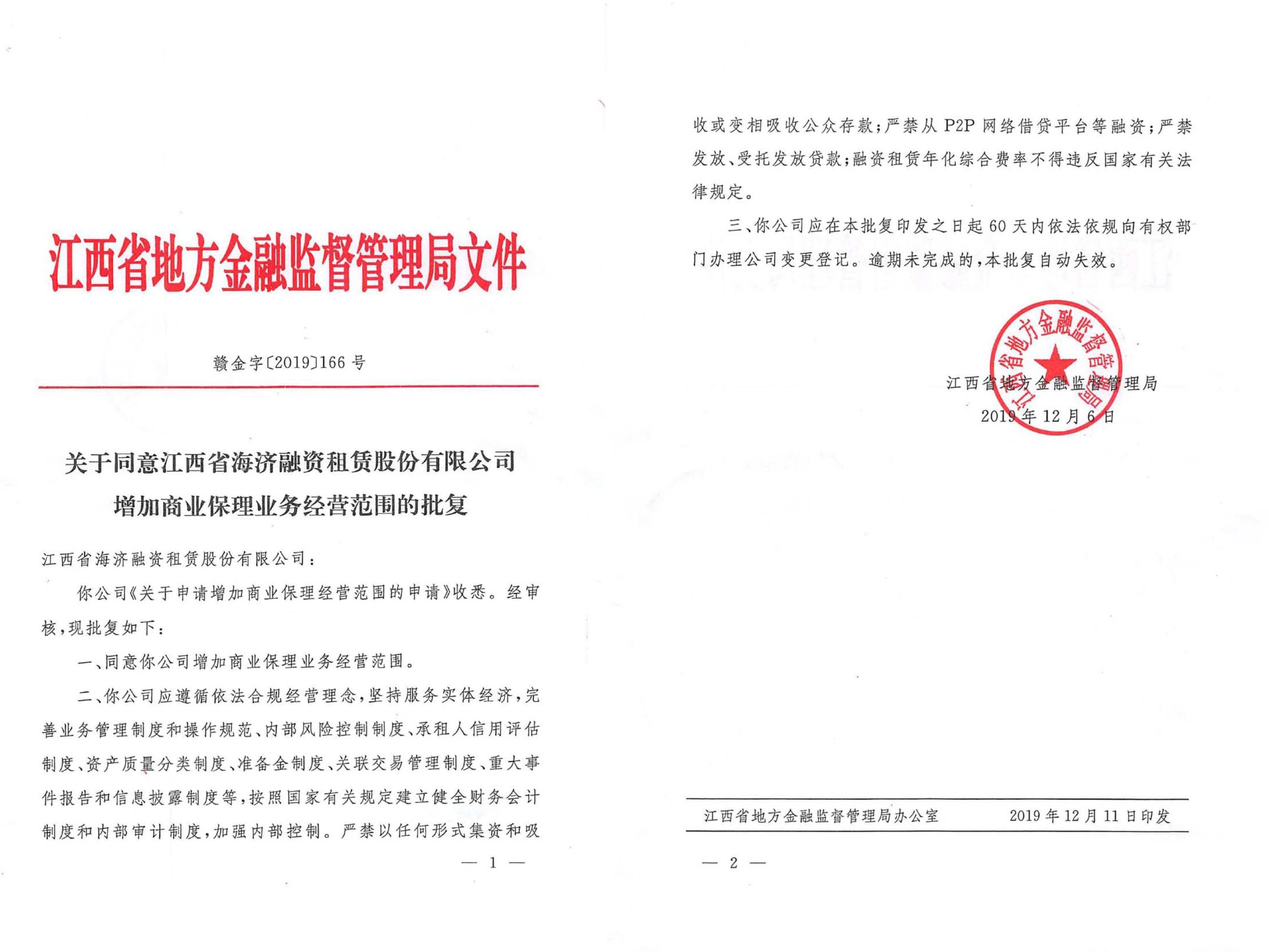 ? ? ? 2019年12月11日,江西省海濟融資租賃股份有限公司經(jīng)營范圍增加商業(yè)保理業(yè)務(wù)獲江西省地方金融監(jiān)督管理局正式批準,12月16日,江西省工商局核發(fā)了新的營業(yè)執(zhí)照。這是海濟公司發(fā)展過程中的重要里程碑,它將進一步提升公司對客戶的全方位服務(wù)能力。
